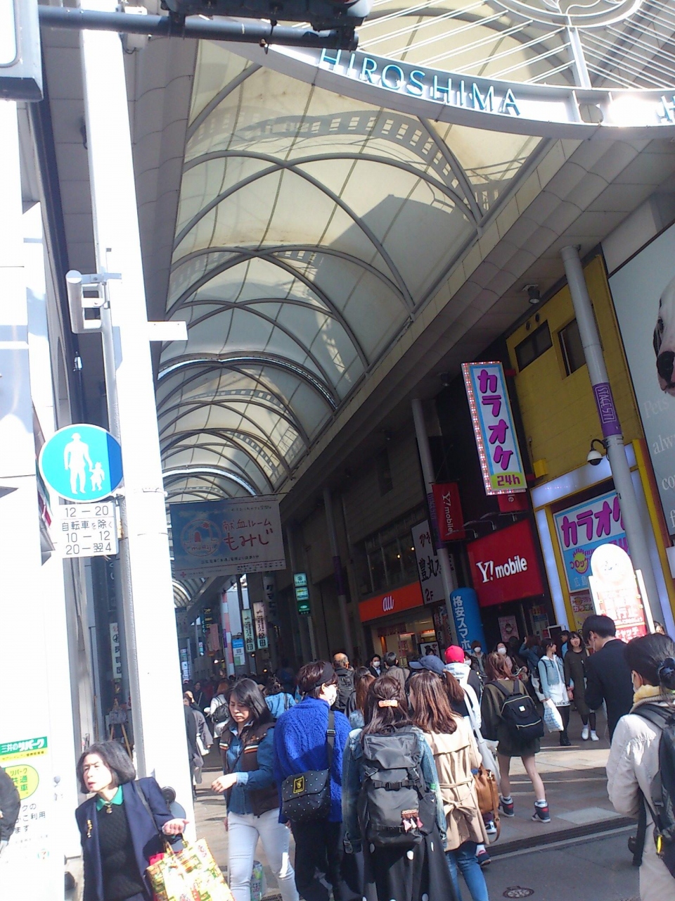 広島平和記念資料館から平和大橋を渡って広島城へ向かう途中で見つけたアーケードのある商店街です。この辺りまで歩いて来ると、急に人混みが増えたので調べてみると、広島で最も賑やかな場所でした。原爆ドームのある元安橋から続いている商店街で、かなり大きいです。