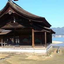 厳島神社の中にある能舞台です。厳島神社の中で、最も大鳥居が綺麗に見える平舞台の近くにあり、完全に海の上に建っています。日本で唯一だそうです。元は福島正則が常設の能舞台を寄進し、浅野家が藩主になってから現在の舞台が整ったそうです。