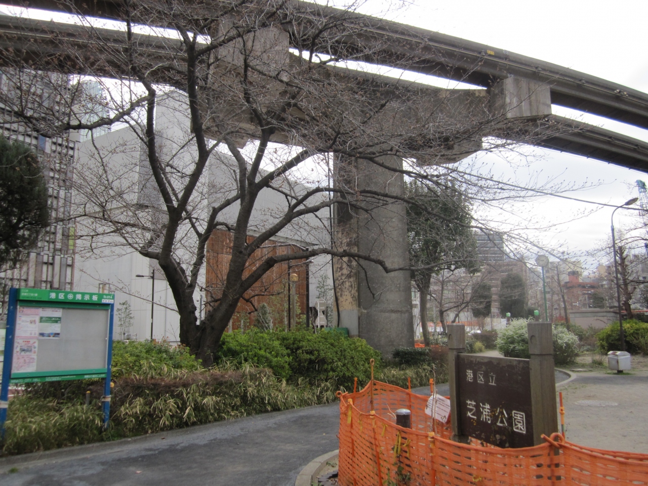 JR田町駅から、みなとパーク芝浦や愛育病院に行く途中、線路沿いにある細長い公園です。園内の上空をモノレールの高架が斜めに横切っている、ちょっと変わった公園でした。ここは海抜2.4メートルという表示がありました。