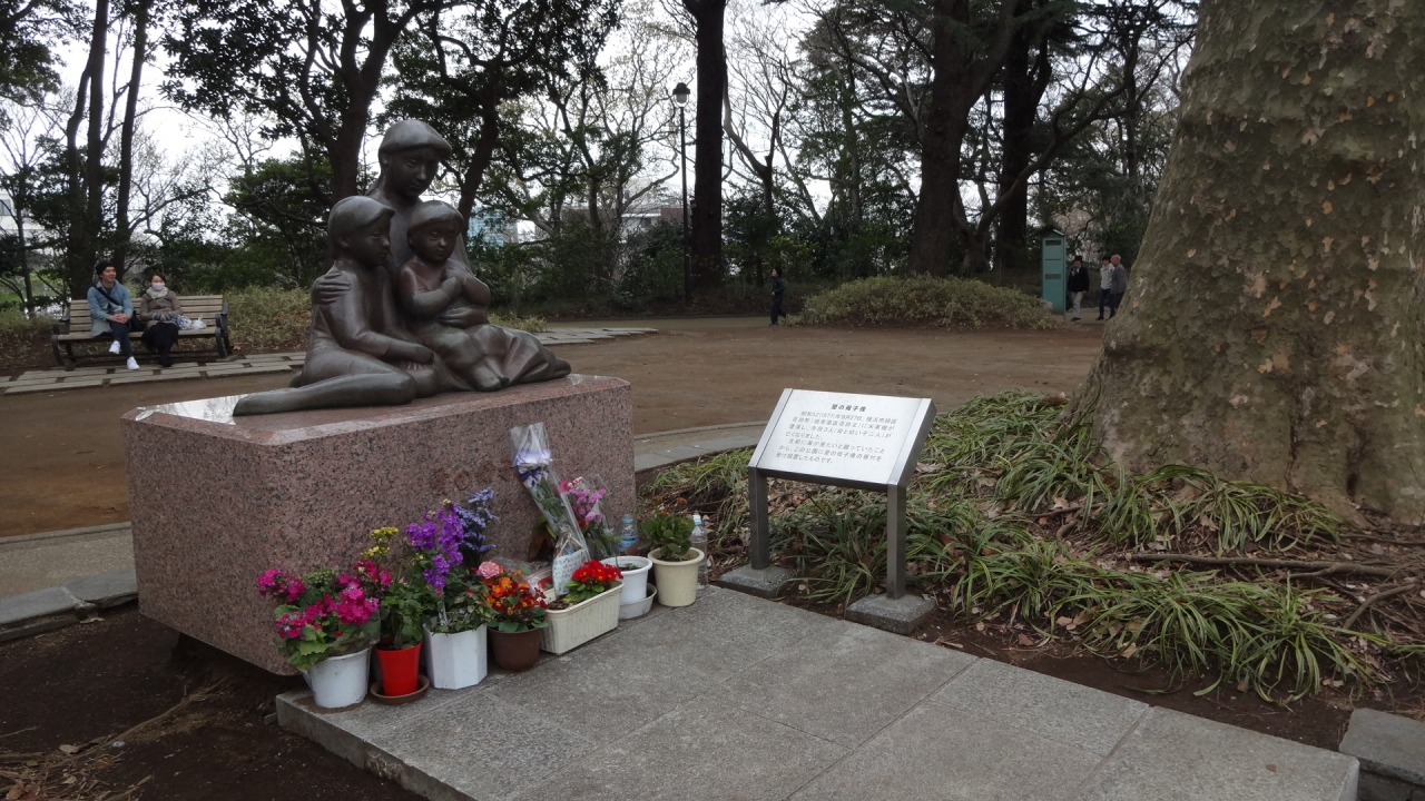 港の見える丘公園、フランス山にあるブロンズ像です。1977年9月27日、横浜市青葉区の住宅地に米軍機が墜落し、一般市民9名が負傷した事件が起き、この時亡くなった幼い子供2人とその母親(土志田和枝さん母子)の姿を記念したものです。生前に海が見たいと話していたことから設置されたそうです。
