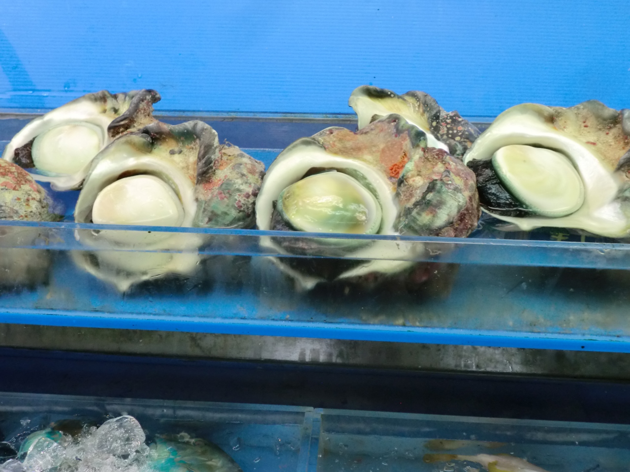 沖縄の鮮魚、もずく、貝、いっぱいです。