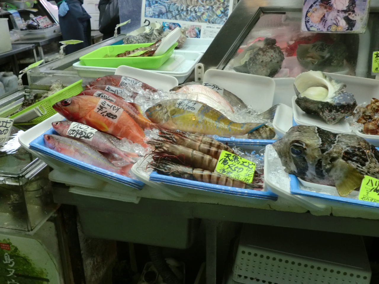 国際通りを県庁前駅の方から歩き、ドンキホーキのところを右手に折れます。そこはもう小さなお店が両脇に並んでいます。その中に鮮魚店がありますが、その周辺も含めて市場になっています。アーケードがあるので、雨でも安心です。鮮魚売り場は、赤、黄色などの魚や、貝、エビ、海ブドウなど、海産物がたくさんあります。500円で3品まで調理をしてくれますが、今回は2回の食堂で刺身盛り合わせを食べました。1000円でしたが、1Fの鮮魚店のお得な刺身盛り合わせは、その半額した。それも購入して、ホテルで泡盛のつまみとなりました。