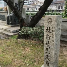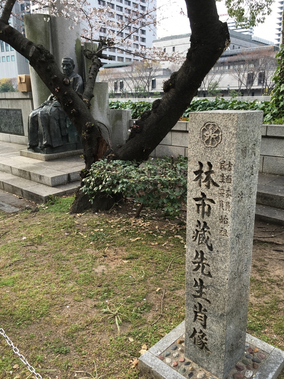 淀屋の屋敷跡を見に行ったら隣に銅像がありました。第15代の大阪府知事などを歴任した偉い人で、方面委員、今の民生委員制度を作った、民生委員の父とも言われているとの解説がありました。銅像は桜の木の下に隠れていました。