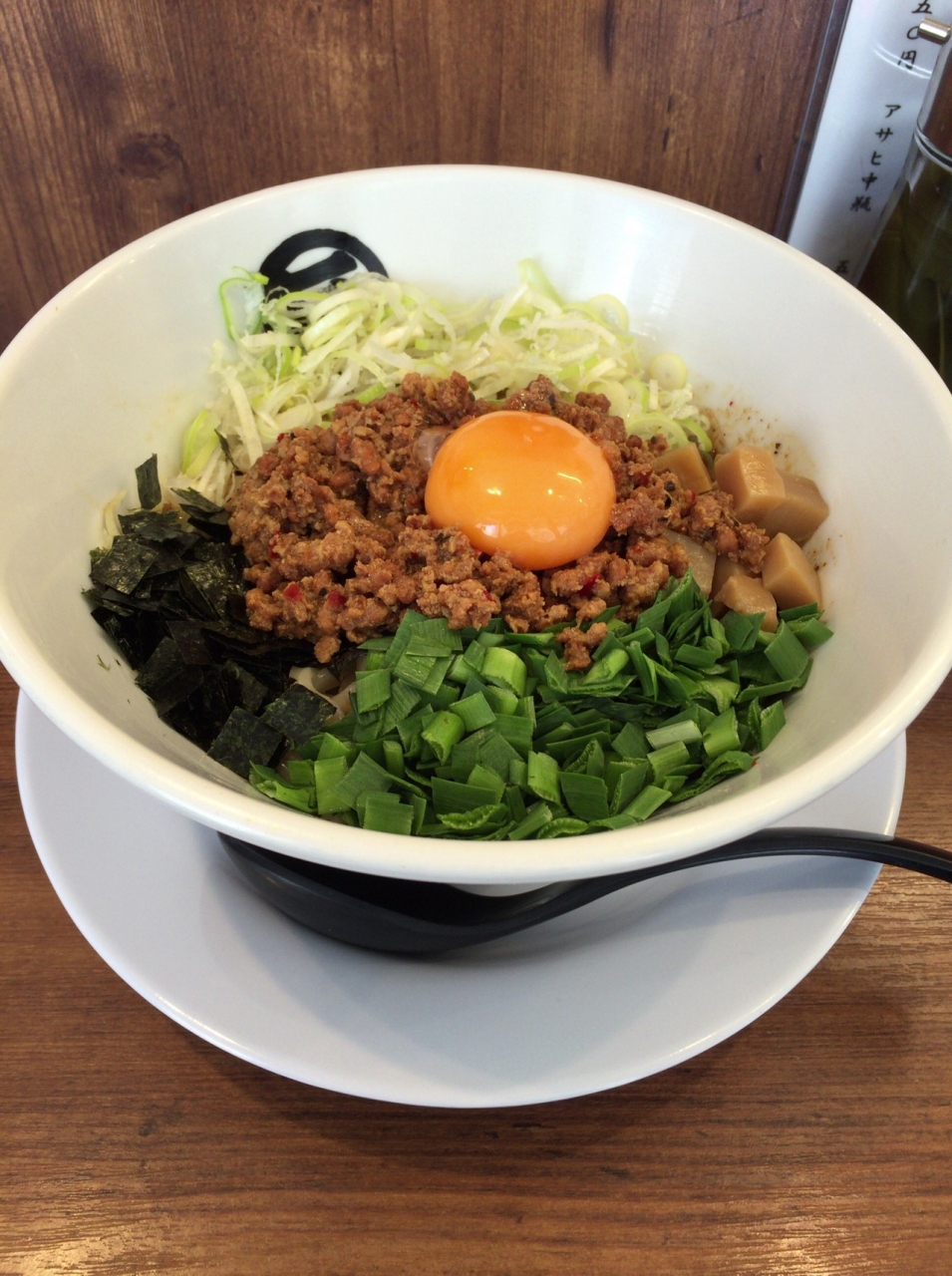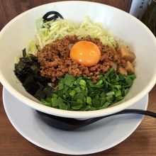 海苔やらネギやらミンチやら、そして生卵がどどんと盛り付けられてます。