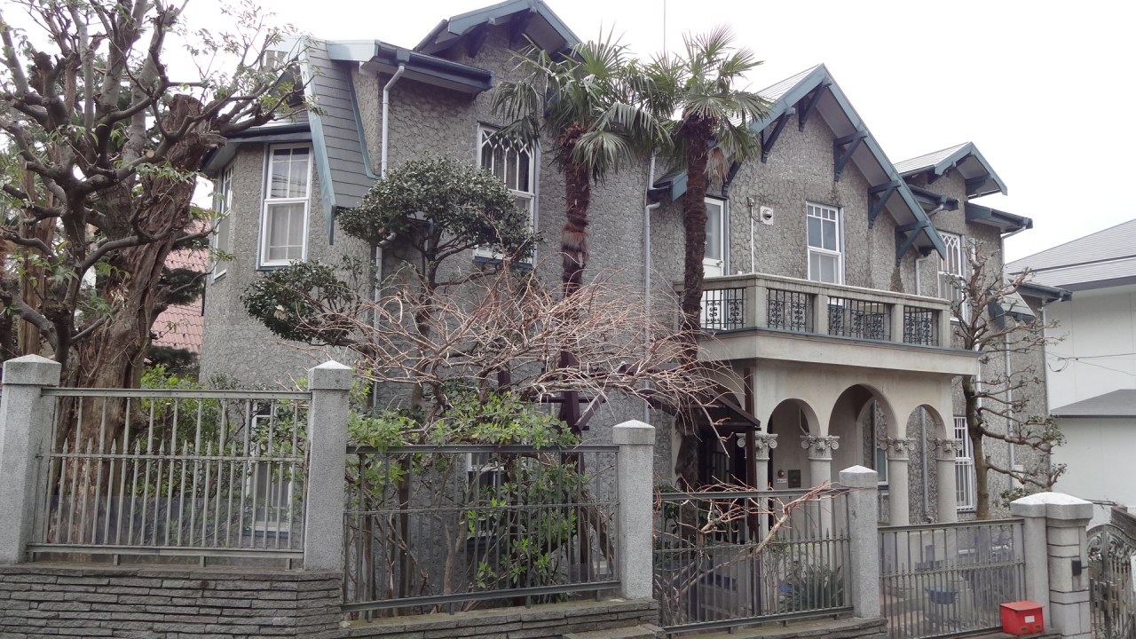 横浜雙葉学園の校庭横の路地を入っていくと、最初の右側の角にあります。昭和7年築の木造2階建てで、設計、施工とも不明です。屋根は切妻、マンサール形式で、ハーフ・ティンバー風の飾りをつけ、独特な屋根構成をもっています。玄関にはポーチがあり、コリント風柱頭飾りがついています。平成6年に横浜市認定歴史的建造物に指定されました。