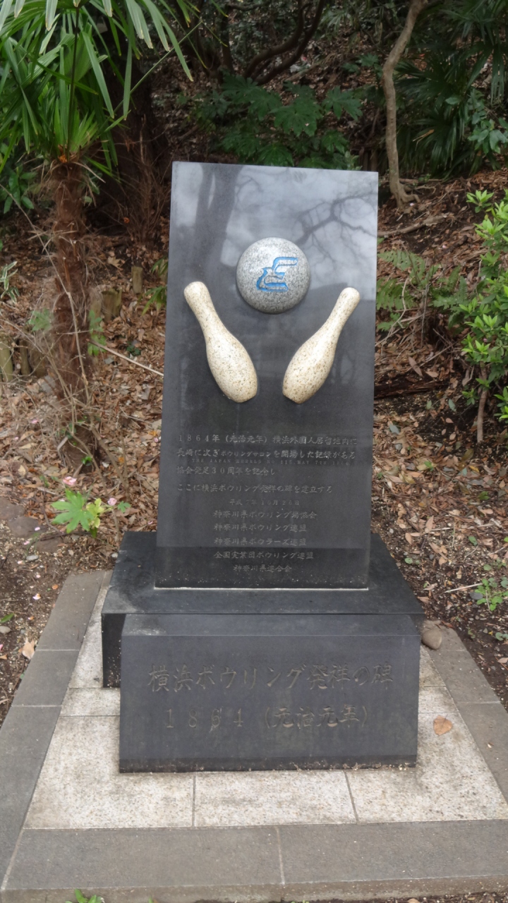 横浜元町「港の見える丘公園」の「フランス山公園」入口横にあります。日本で初めてボウリング場ができたのは、1861年6月22日のことで、長崎県の出島(外国人居留地)にオープンしました。2番目にできたのが横浜でした。それを記念して建てられたのがこの記念碑です。