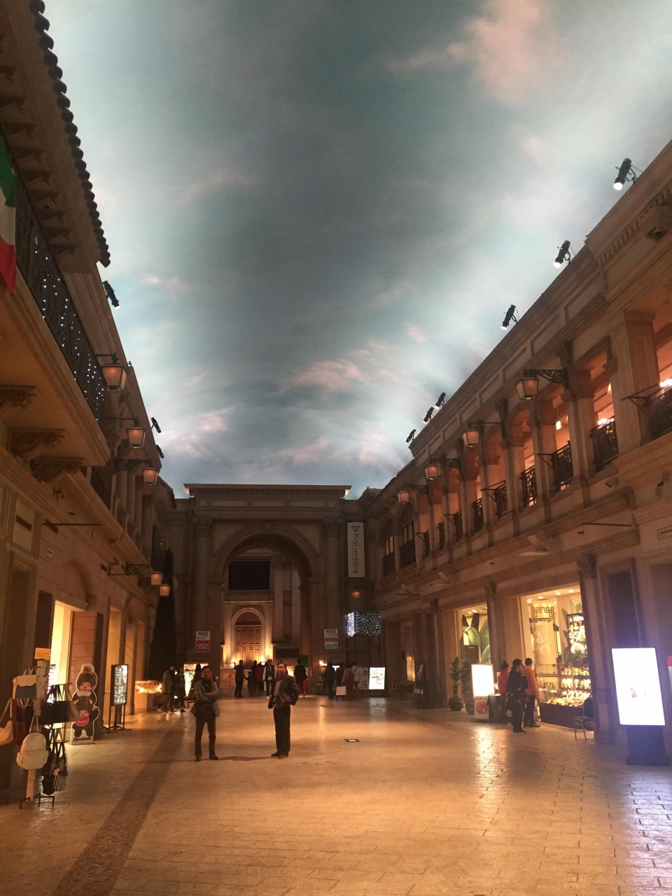 入っているショップはそれほど目を引きませんが、イタリアの街を彷彿とさせる凝った内装が印象的です。青空を模した天井は、まるで外を歩いているような気分でした。ところどころに広場があり、本物の噴水は圧巻。協会広場の前にはイタリアンレストランがあり、まるでローマかどこかで食事をしているような雰囲気に浸れます。1階に大きなニトリのショップがありました。