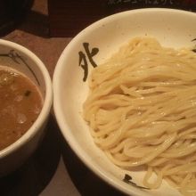 店のオススメは1000円以上する角煮と特製餡のかかった「外伝○○」のようだが、胸焼けしそうなので、さっぱりと「濃厚」のつかない味玉つけ麺を券売機で購入。麺の量は大盛りまで選べたので、中盛りを注文。