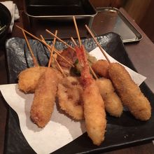 場所がよくわからない。一角を4周してしまった。ビルの奥まったところにようやく発見。夜中の2時頃来店。他に客はおらず、貸し切り状態。串カツのおまかせを発注。夜中ということを割り引いても、油ギトギト感のない串カツで食べやすかった。ただ場所で1点減点。