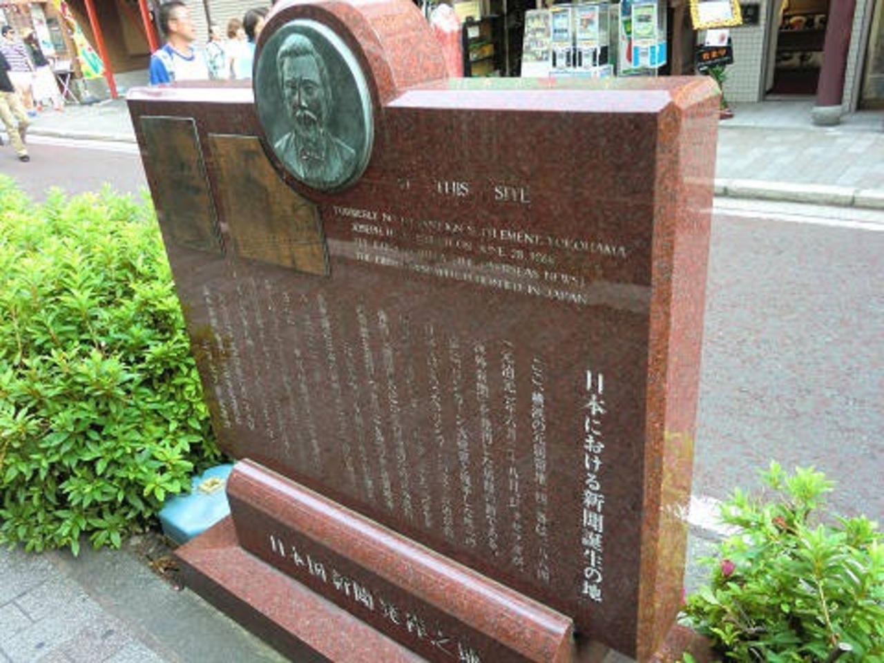 横浜中華街の關帝廟通りにある日本国新聞発祥の地碑です。新しく割と立派な碑になっています。