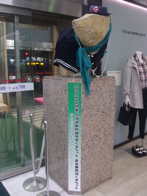 函館のローカル百貨店としてお馴染みの棒二森屋の1Fには、クマさんの像が二体設置されていますが、今回は北海道新幹線の開業4日前の訪問、ということもあってか、クマさん達が北海道新幹線の車掌さん、客室乗務員さんに化けていました。この姿がいつまで見られるのかは不明ですが、少なくとも開業暫くは見られるかと思いますので、是非入口のクマさんの愛らしい姿を拝みに足を運んでみて下さい。