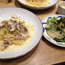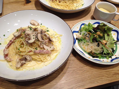 パスタはマッシュルームとベーコンのカルボナーラ(1190円+税)をチョイス。