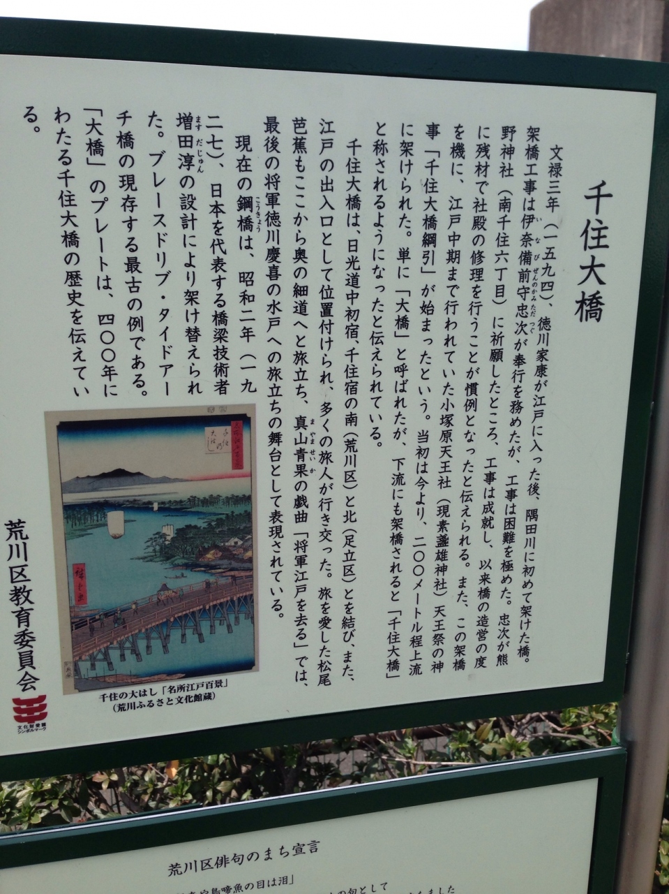 足立区と荒川区を結ぶ隅田川に掛かるこの橋は 1594年 徳川家康が江戸に入り始めて掛けたもの しかも隅田川で初めての橋とゆう…とても素晴らしい歴史ある橋です。 当時は 大橋 だったのだが 大橋がたくさんできて 千住大橋になったそうです。