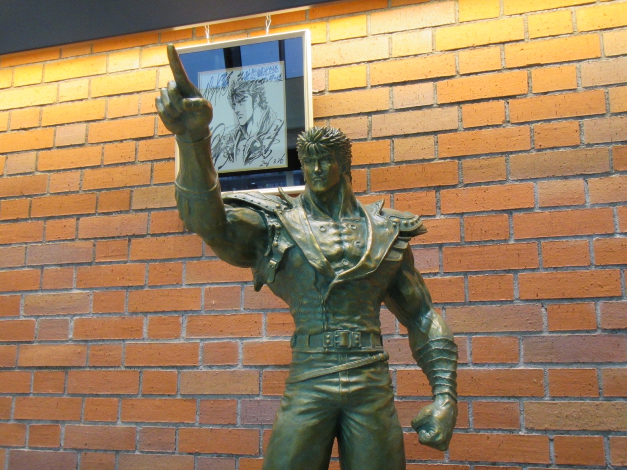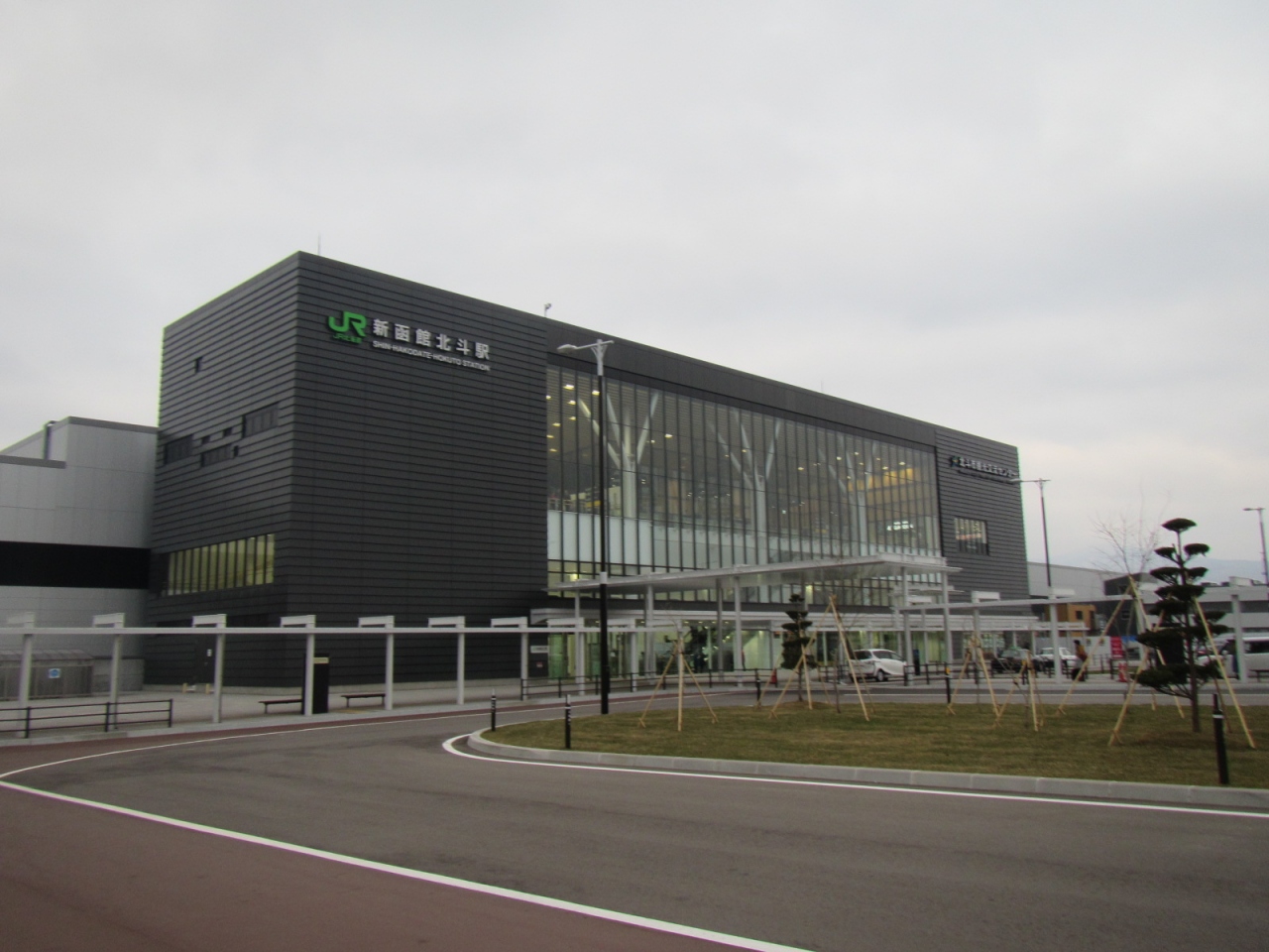 シンプルな駅ですが、正面出口側の1階に北斗の拳の小さな銅像、道南の縄文、アイヌ文化を紹介するミニコーナー、そして在来線側には2階コンコース内に2015年に札幌の北海道博物館で展示していた夷酋列像の絵が飾られていました。