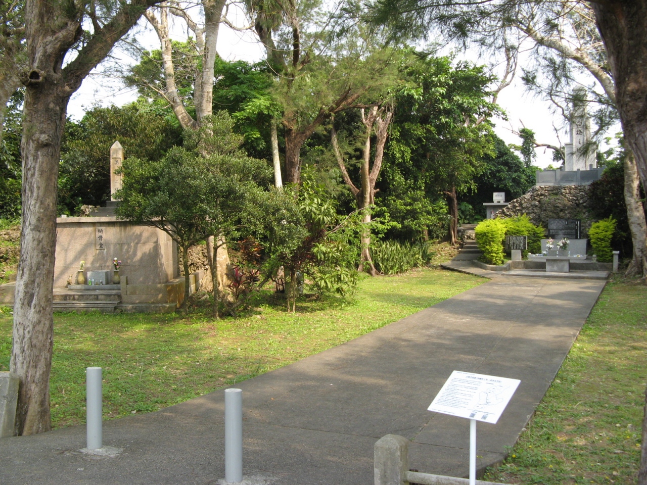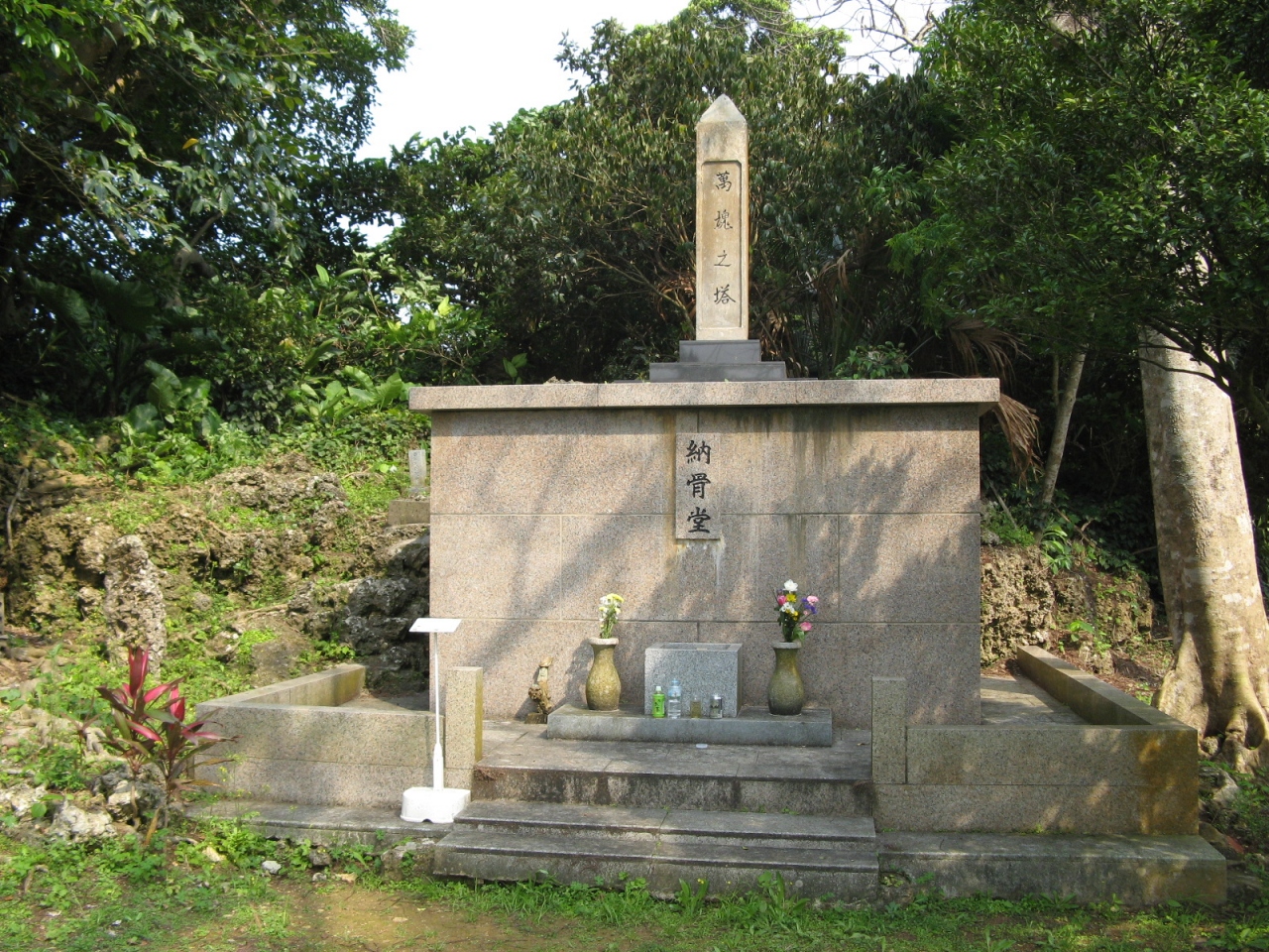 県道250号線の国吉の集落付近から分かれて県道54号線に入り300mほど南下して、右手にある“白梅の塔”の案内板に従って進むと“白梅の塔”と同じ敷地内に「萬魂之塔」があります。