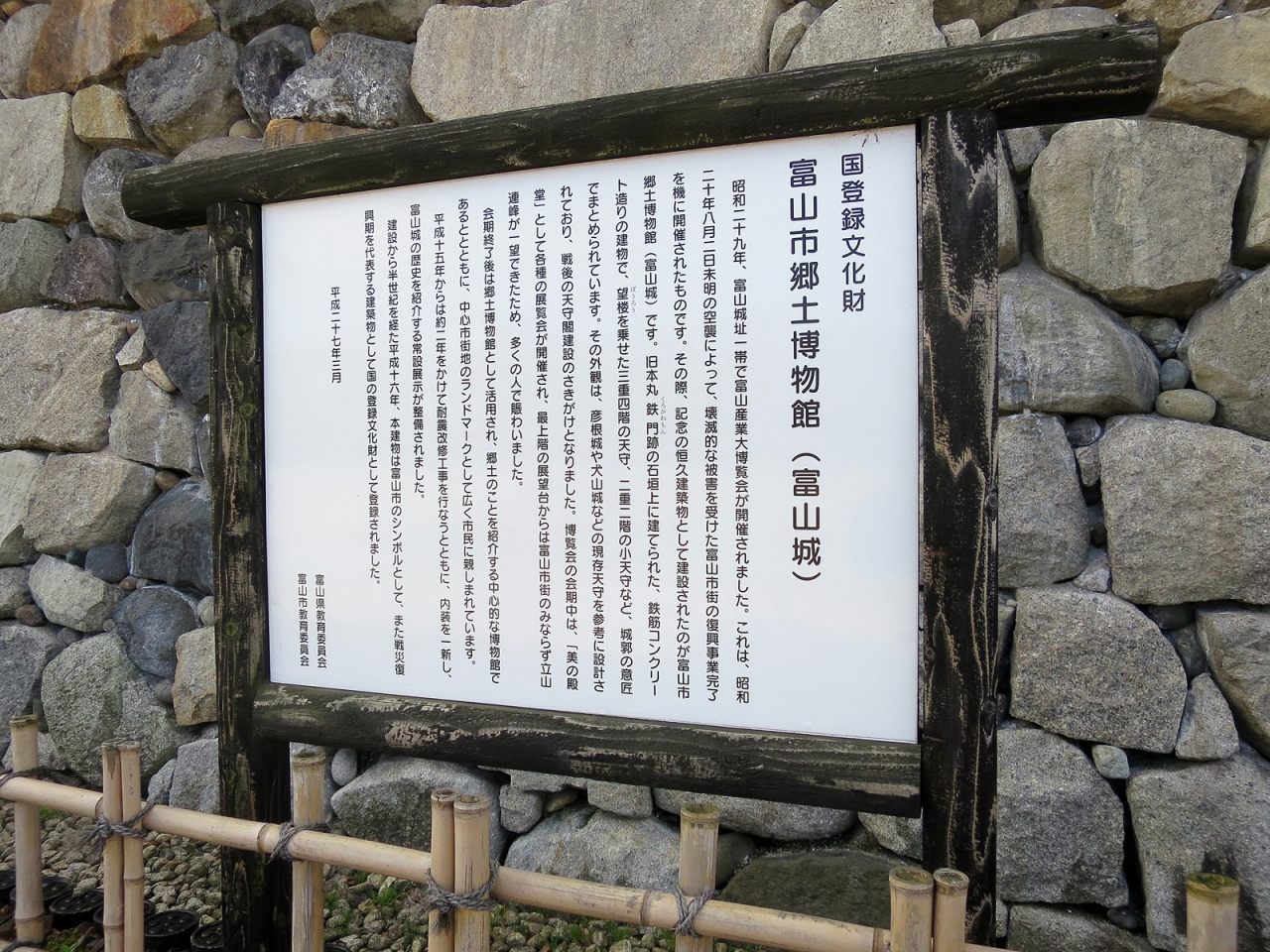 少し調べると分かることですが、元々の「富山城」には天守はありませんでしたから、現在「富山城」と呼ばれている建物は、富山産業大博覧会の記念建築物として昭和29年に建てられた模擬天守閣になります。近年、城郭の復元・修復については史実・史料に基づいた正確さが求められるようになりましたが、そうした風潮とはまったく別の道を歩んだ建築物が建てられたということは、その建設当時としては問題がなかったのでしょう。ただ、この建物が史実を反映していないことを理解することなしに見学する人がいると思うと、少し恐ろしい気もします。