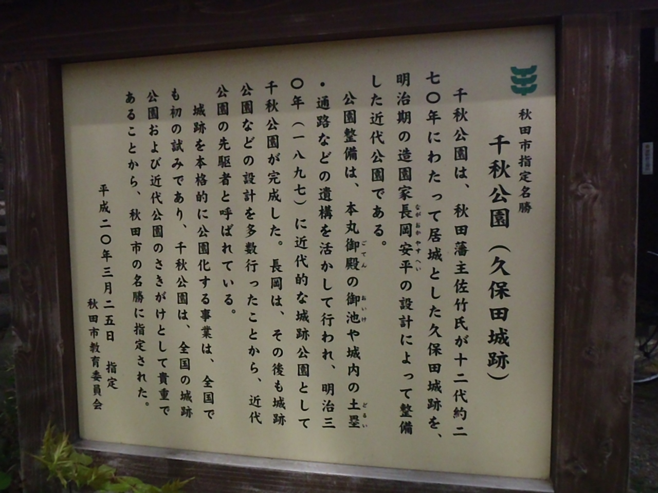 JR秋田駅西口から約1km徒歩で15分ほどの所にある、秋田藩二十万石佐竹氏の居城久保田城跡を明治期に本丸御殿、御池、土塁などを活かして造られた公園です。