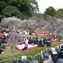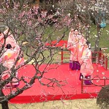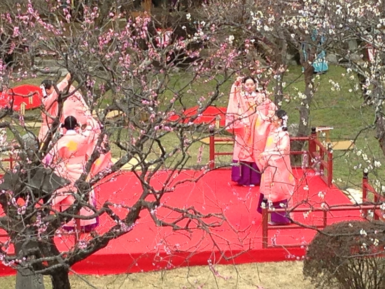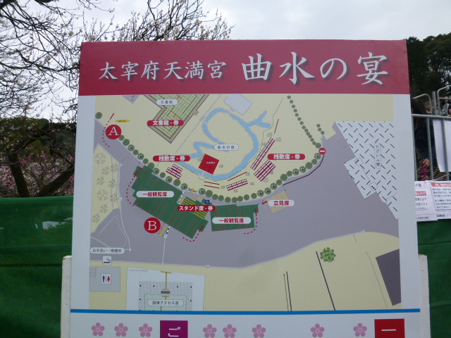 学問の神様で有名な菅原道真公の太宰府天満宮ですが、今日は梅満開、曲水の宴を見るためにきました。そのメイン会場はここ「曲水の庭」となります。普段はこの前は歩ける通路になっているのですが、今日ばかりは観覧席が造られています。今日は小雨が降ったりやんだりです。皆様もご一緒に楽しみましょう。