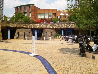 飲食店が立ち並ぶビル一階には、石畳の公共屋外スペースがある。ここにはイスやテーブルがしつらえてあり、テイクアウトした食事を持ち込んで楽しめる。近くの運河と広場の噴水の噴水が涼を感じさせ、爽やかな風を感じながらブランチが楽しめる。