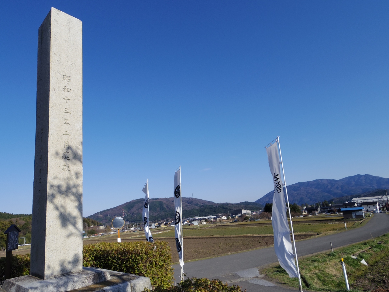 現在は、のどかな田園風景が広がり、400年余り前の壮絶な戦いをしのばせるものはありませんが、記念碑やのぼりが立ち、風に吹かれているばかりで、想像をふくらませて大いに楽しみ、語り合うほかありませんでした。