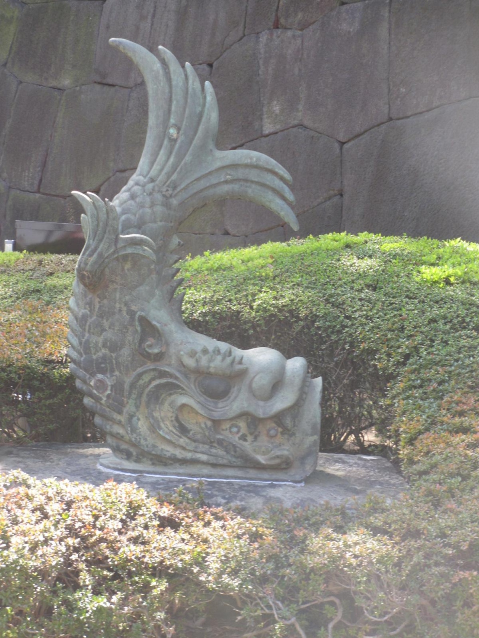 大手門には門が2つあり、高麗門と大手渡櫓門がありますがその2つの門の間の場所に鯱 (しゃちほこ)はあります。1945年に戦災で消失した旧大手門渡櫓に飾られていた鯱だそうです。17世紀に造られたと推定されるそうで、歴史を感じました。
