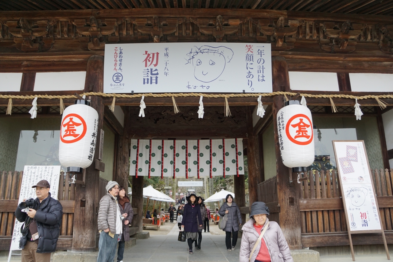 これは金刀比羅宮の総門。 高松藩初代藩主の松平頼重から寄進されたもの。二層入母屋造瓦葺の堂々とした姿で、「琴平山」の額が掛かっていて、これは有栖川宮熾仁親王の親筆です。