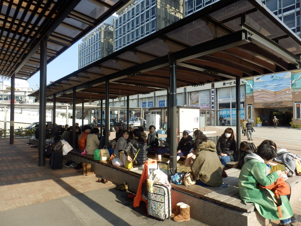 熱海駅を出てすぐ、大きな屋根の下に広い足湯があります。小さな旅館の大浴場かと思うほどの広さで、25人が入れるそうです。土曜日の夕方頃に訪れたら、足湯の周りには人だかりが出来ていて、とても入れそうになかったです。