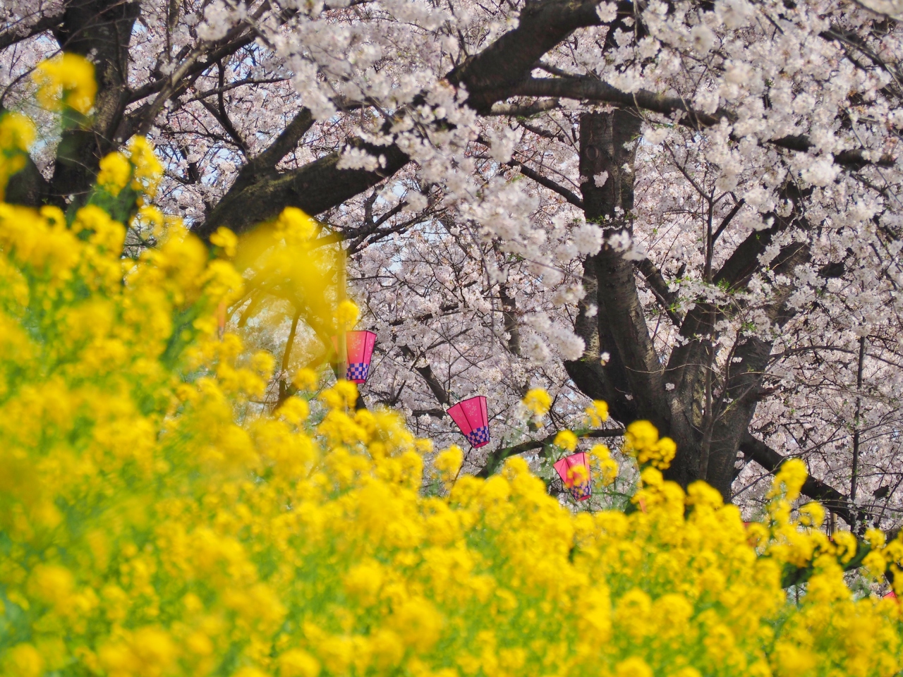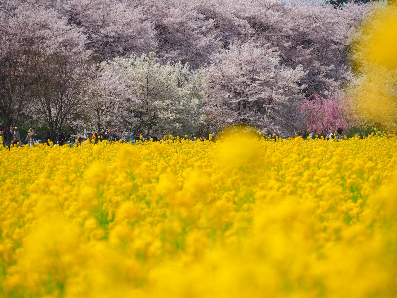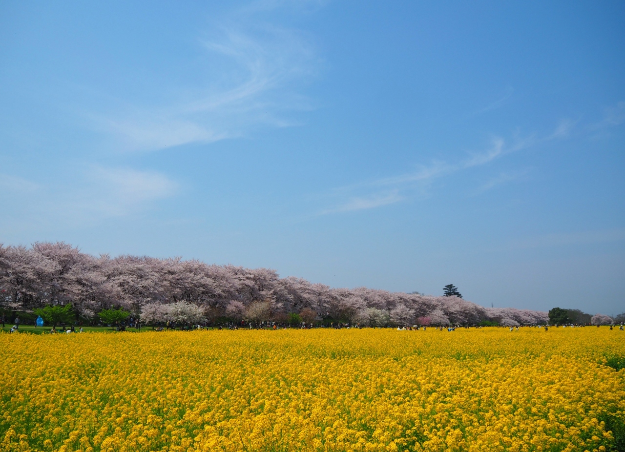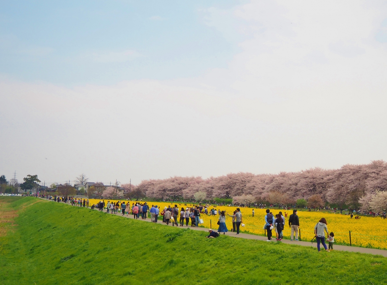 1キロ約1000本の桜並木と一面の菜の花畑の織りなす絶景、権現堂桜堤。そのスケールと類を見ない美しさは言葉を失うほどです。
