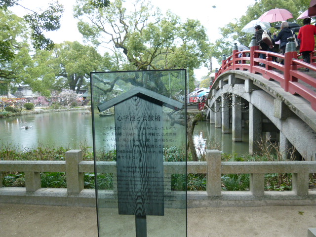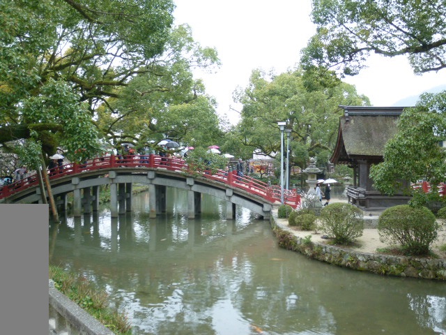 学問の神様で有名な菅原道真公の太宰府天満宮ですが、今日は梅満開、曲水の宴を見るためにきました。ここ「太鼓橋」はその曲水の宴で平安絵巻に出てくるような衣装での行列も行われます。華麗な姿です。また、この橋は三つに分かれ、過去・現在・未来と順に本殿に向かって歩くのですが、逆行している方がいます。写真に夢中な中国人に多いです。良くない、と聞いたことがあります。