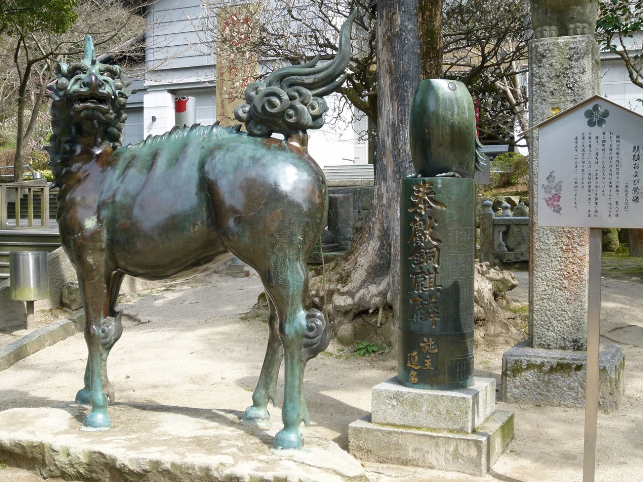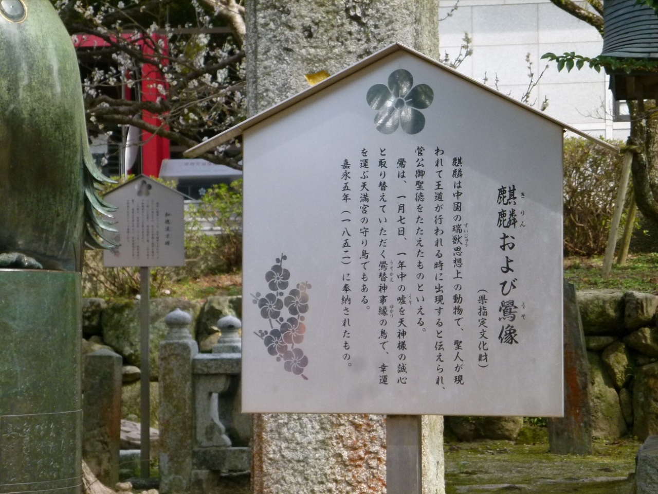 学問の神様で有名な菅原道真公の太宰府天満宮ですが今日は梅満開、参道から太鼓橋と楼門前まで来ました。右手に「麒麟像」が建っています。150年程前に菅公御聖徳をたたえ奉納? 動物園にいるキリンとは大きく違いますね、胴体は馬?頭は龍? 麒麟とは中国の思想上の動物で現実の動物ではないようです。それとも麒麟ビールの麒麟。