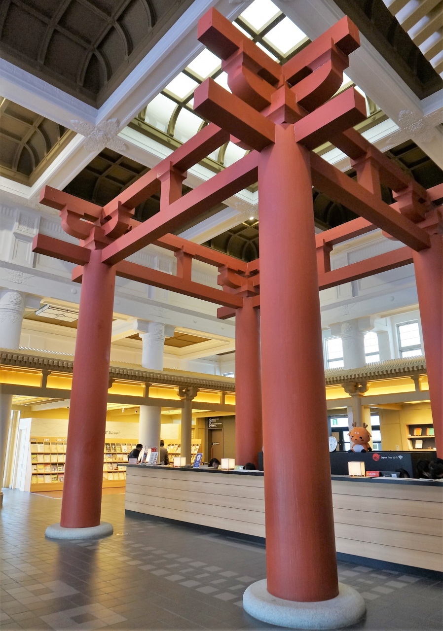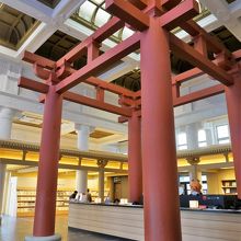 内部も天井が高く、朱の柱と組み物が真ん中にあって、ちょっと感動。