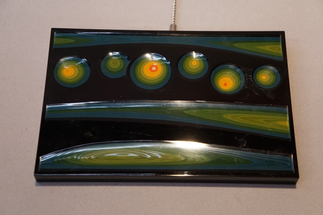香川漆器の基礎技法である彫漆(ちょうしつ)、存清(ぞんせい)、蒟醤(きんま)の見本と解説
