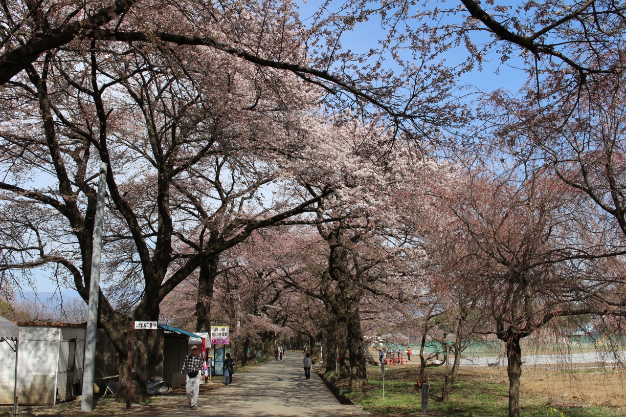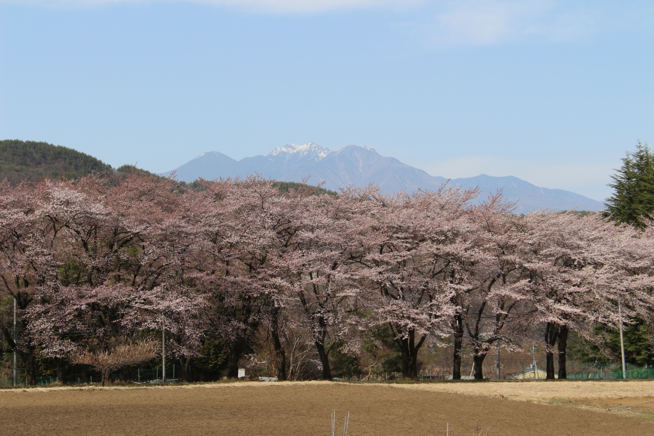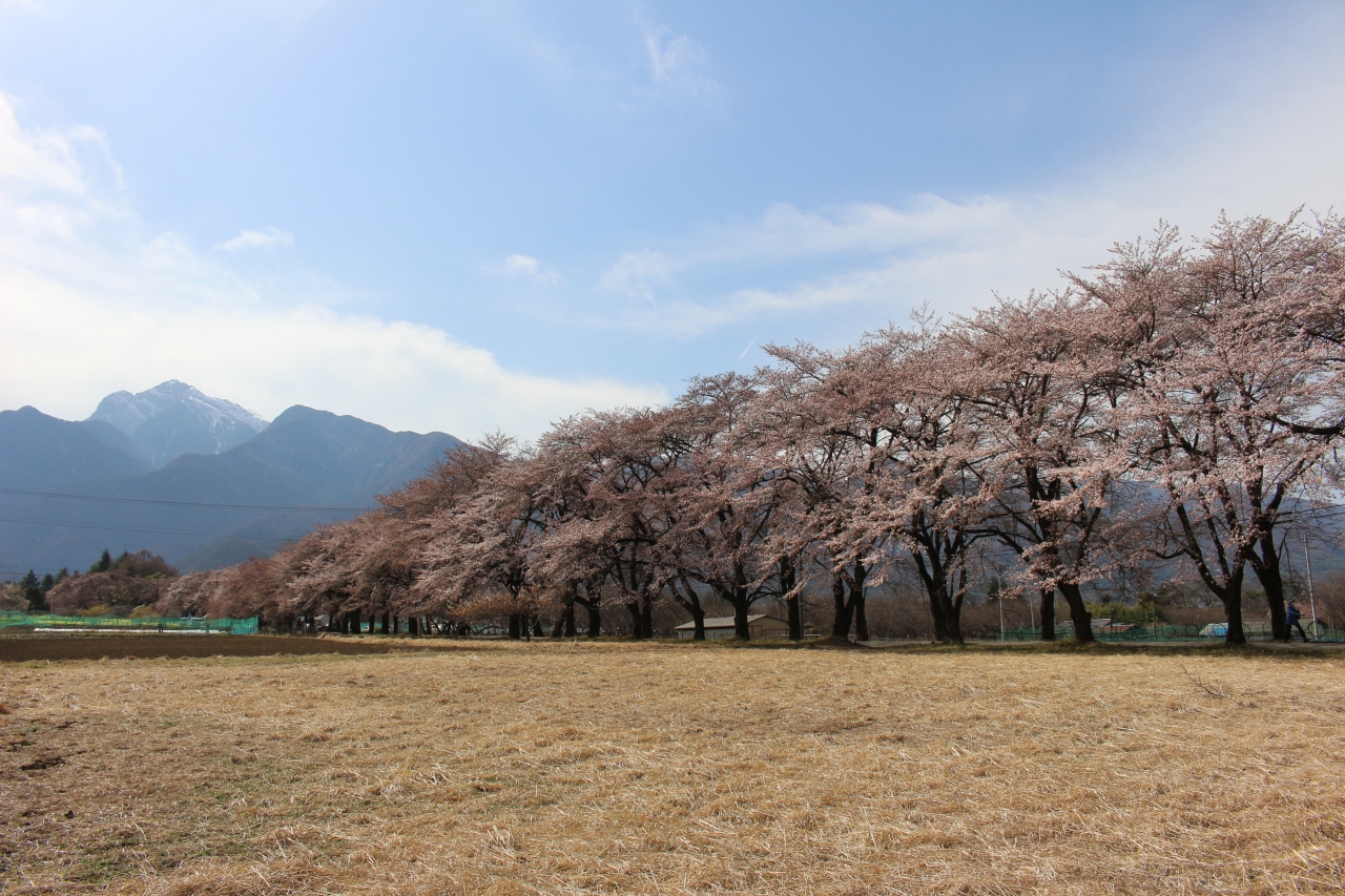 山高神代桜の少し先にあり、背後の甲斐駒ケ岳と桜並木が美しいポイントです。