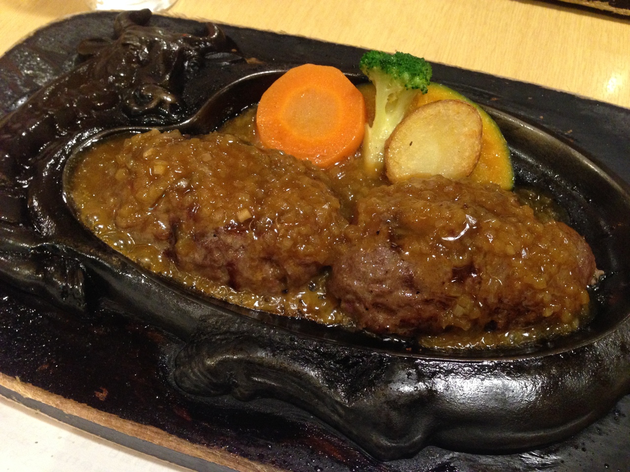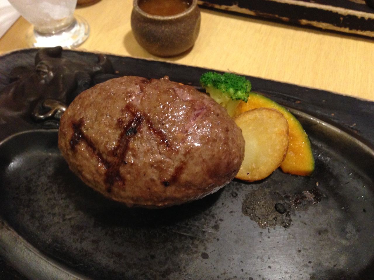 静岡の友人の話を聞いていつかは行きたいと思っていたさわやか初訪問です。店内にはげんこつハンバーグの写真が貼られイチオシなのがわかりましたが、一回り小さいおにぎりハンバーグをオーダー。ボール型で運ばれ店員さんが切って焼き〆作業をしてくれます。噛み応えのあるハンバーグでした。