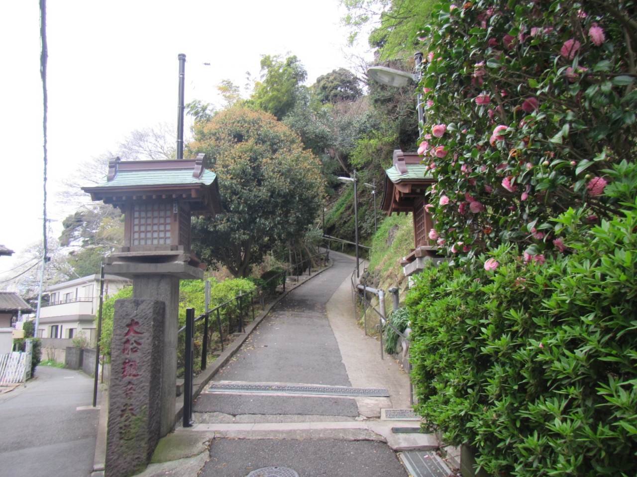 コンビニのローソンの横に“大船観音入口”の看板があるので、細い路地を進むと観音様へ行く狭い坂道の入口があります。