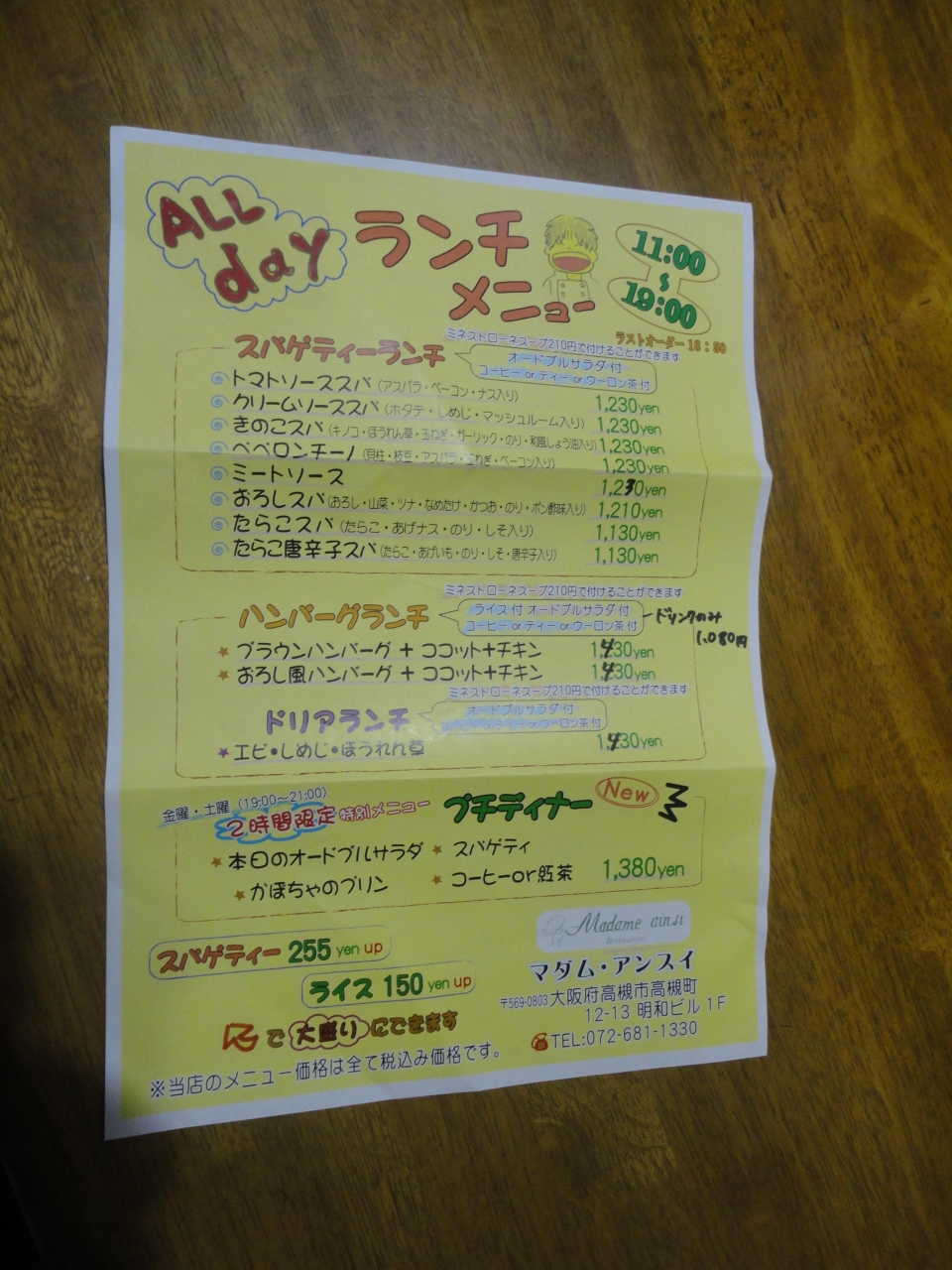 平日の金曜日に友達とランチに行きました。11:45くらいに行くとお客は1組で、すいてました。私は初めてでした。スパゲティーランチとハンバーグランチがありオードブルサラダと飲み物付きを注文。デザートのケーキ310円も注文。