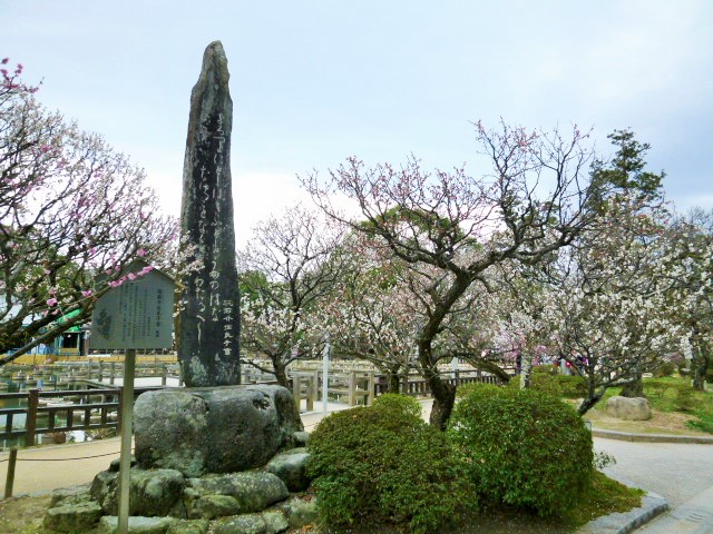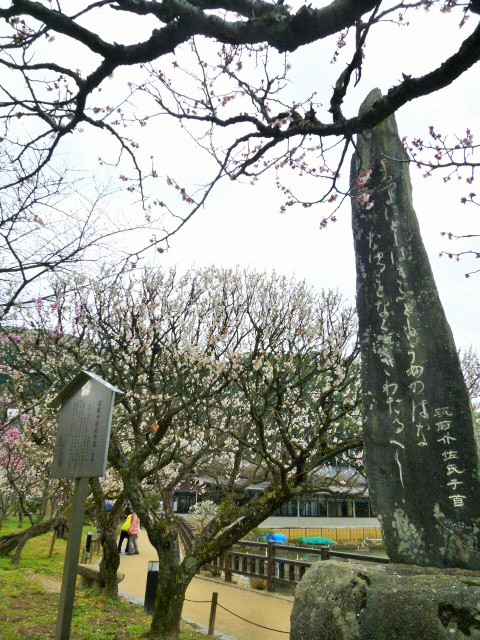 今日は大宰府天満宮を参拝し付近をぶらぶらしています。九州博物館の方へ歩いて行くと池があります。ここは6月になると見事な花菖蒲(はなしょうぶ)が咲くようです。そしてその前に「筑前介佐氏子首歌碑」はあります。なんと書いているのでしょうか、達筆すぎて読めません。あとで調べると「よろつよに としはきふとも うめのはな たゆることなく さきわたるべし」と書いてあり、簡単に言うと「時は過ぎ去っても、梅の花は絶えず咲き続けて欲しい」と願った詩のようです。私もそう思います。西暦730年「梅の花」の宴で読まれた一首のようです。