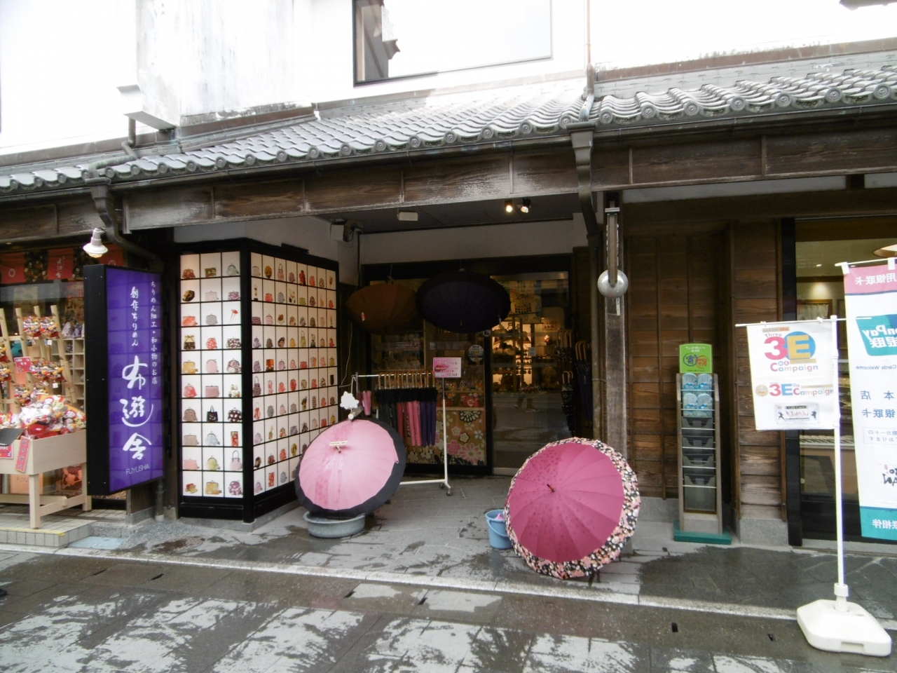 「布遊舎」はちりめん生地を使った商品を販売しており、女性客や海外の観光客で賑わっていた。伝統的な柄物ちりめん生地で出来たなつかしいがま口が人気で、いろいろ種類が豊富であった。これだったらプレゼントで喜んでくれるだろう。
