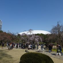 入ってみて、すごい景観だなぁと、ちょっとあきれました。正面に東京ドームが借景となっています。ジェットコースターも見えました。左に文京区役所、文京シビックセンターの高層ビルが聳えています。右側にもビルが多数。ドームでプロ野球をやっており、応援の音声が響いていました。