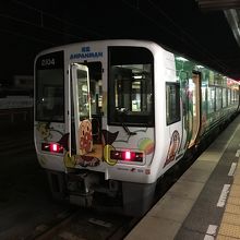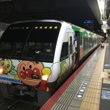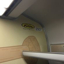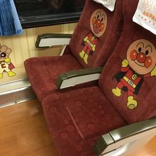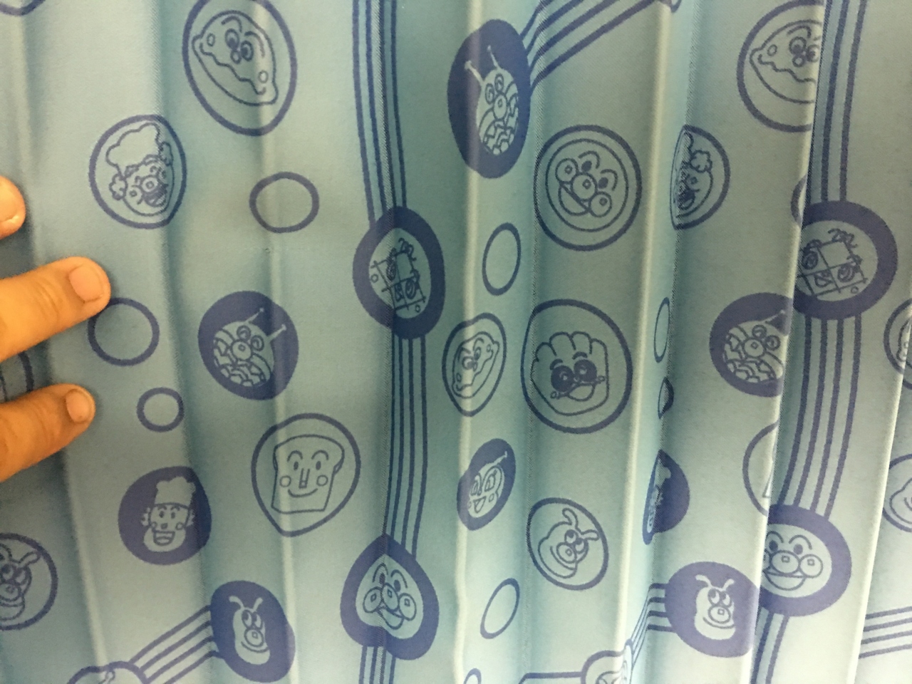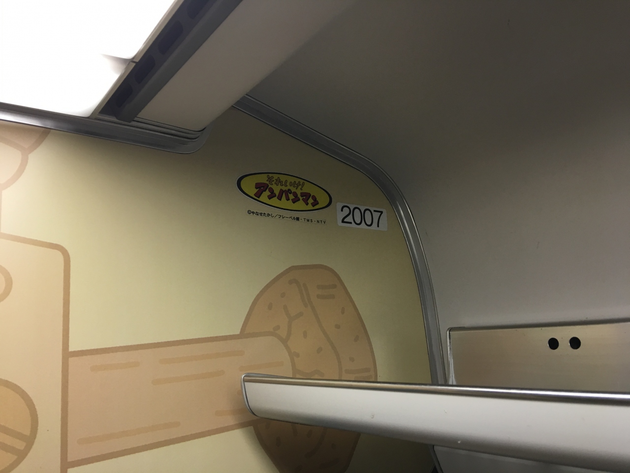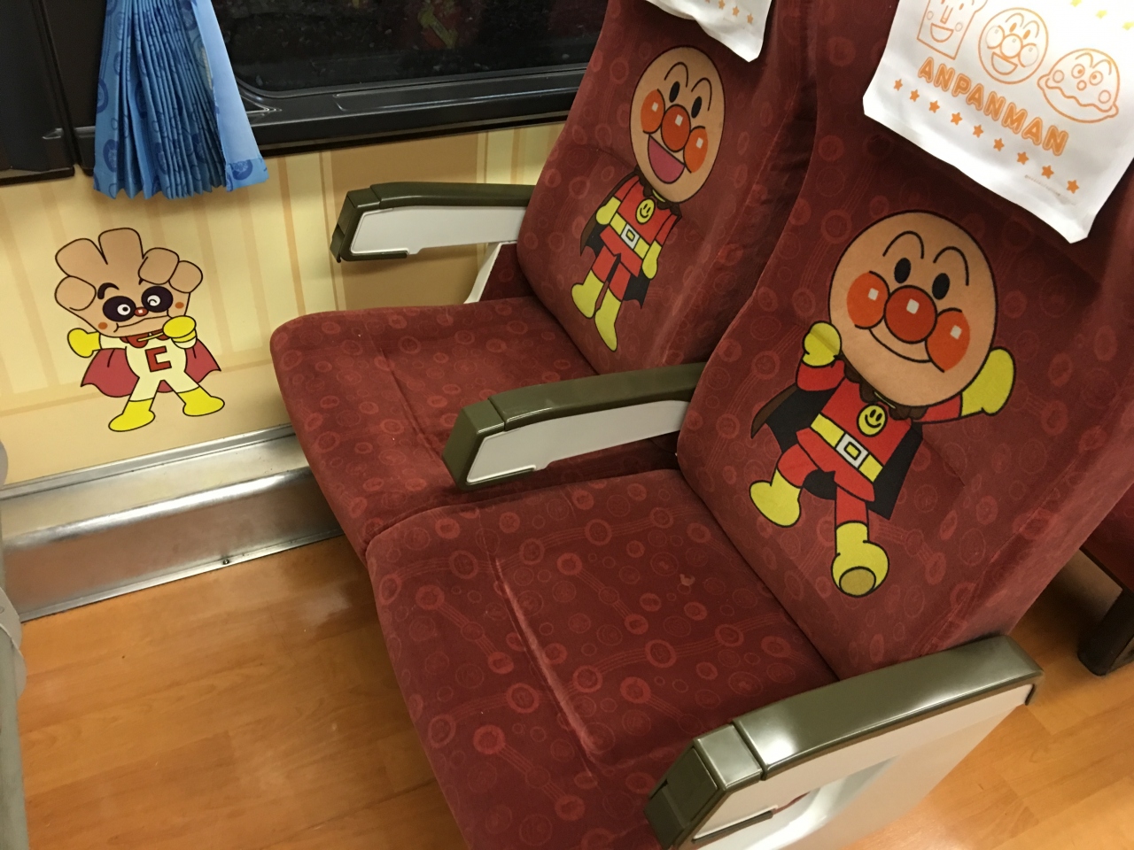 たまたま乗車したのがアンパンマン列車だった。グリーン車は特に変わりはないようだけど指定席の部分は座席やカーテンなどにアンパンマンのイラストが描かれていた。