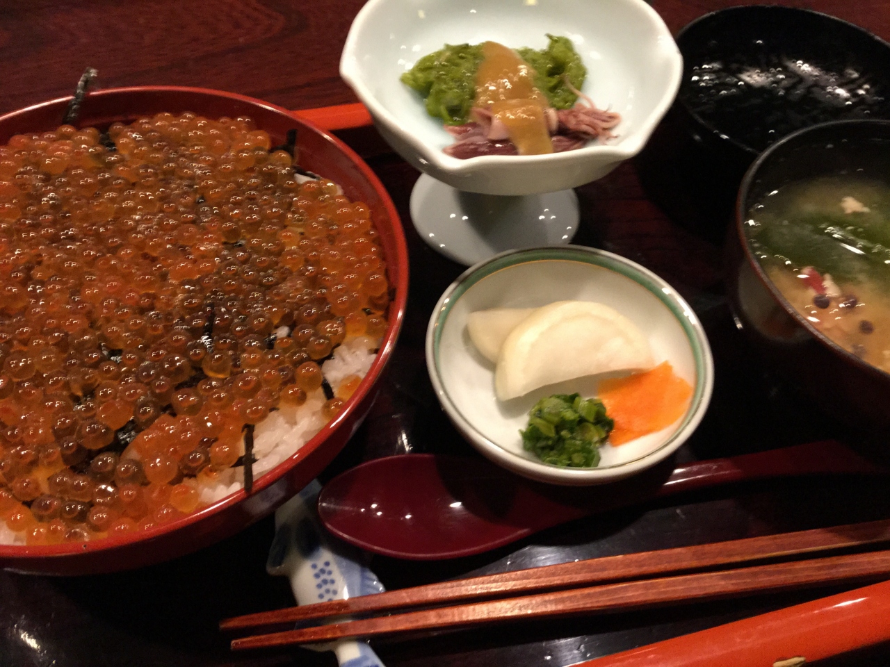 はらこ丼(大) (1500円)を注文。小鉢、蝦頭の入った味噌汁に香の物が付いてきます。