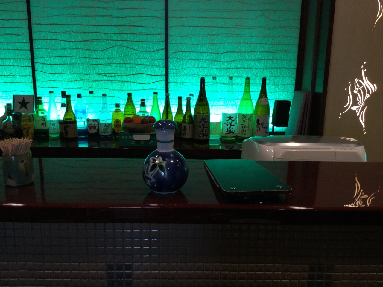 - ジャズのBGMが流れる中、カウンター越しには越後の銘酒が。