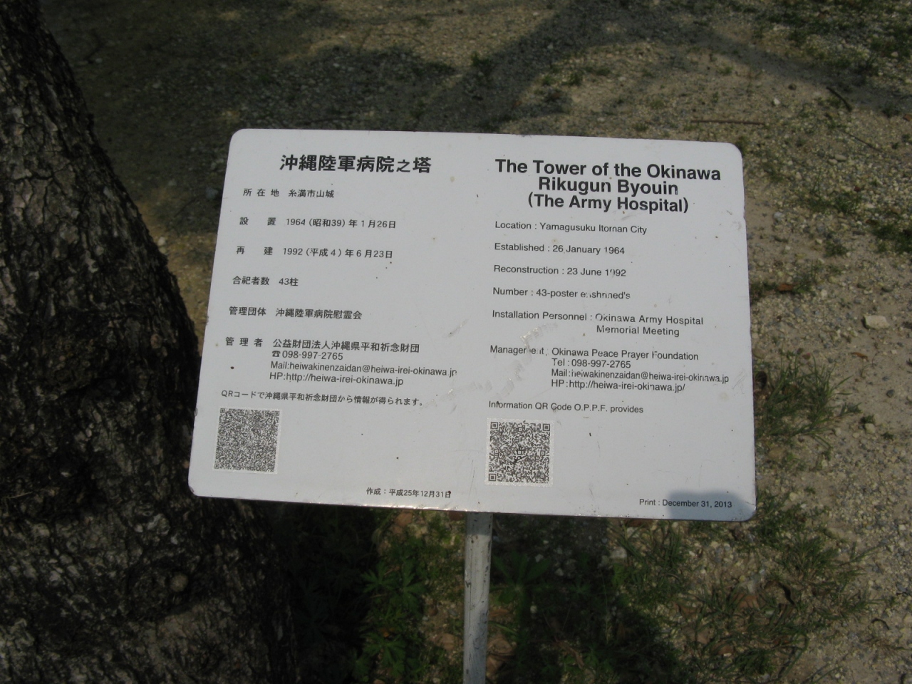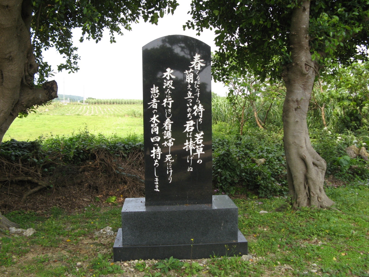沖縄線末期、ここで傷病兵の治療にあたった沖縄陸軍病院勤務の関係者43名を祀る慰霊塔です。慰霊塔の横には、『春くると ひたすら待ちし 若草の 萌え立ついのち 君は捧げぬ』 『水汲みに 行きし看護師 死ににけり 患者の水筒 四つ持ちしまま』と刻まれた歌碑があり、当時の様子が偲ばれて胸に来るものがありました。