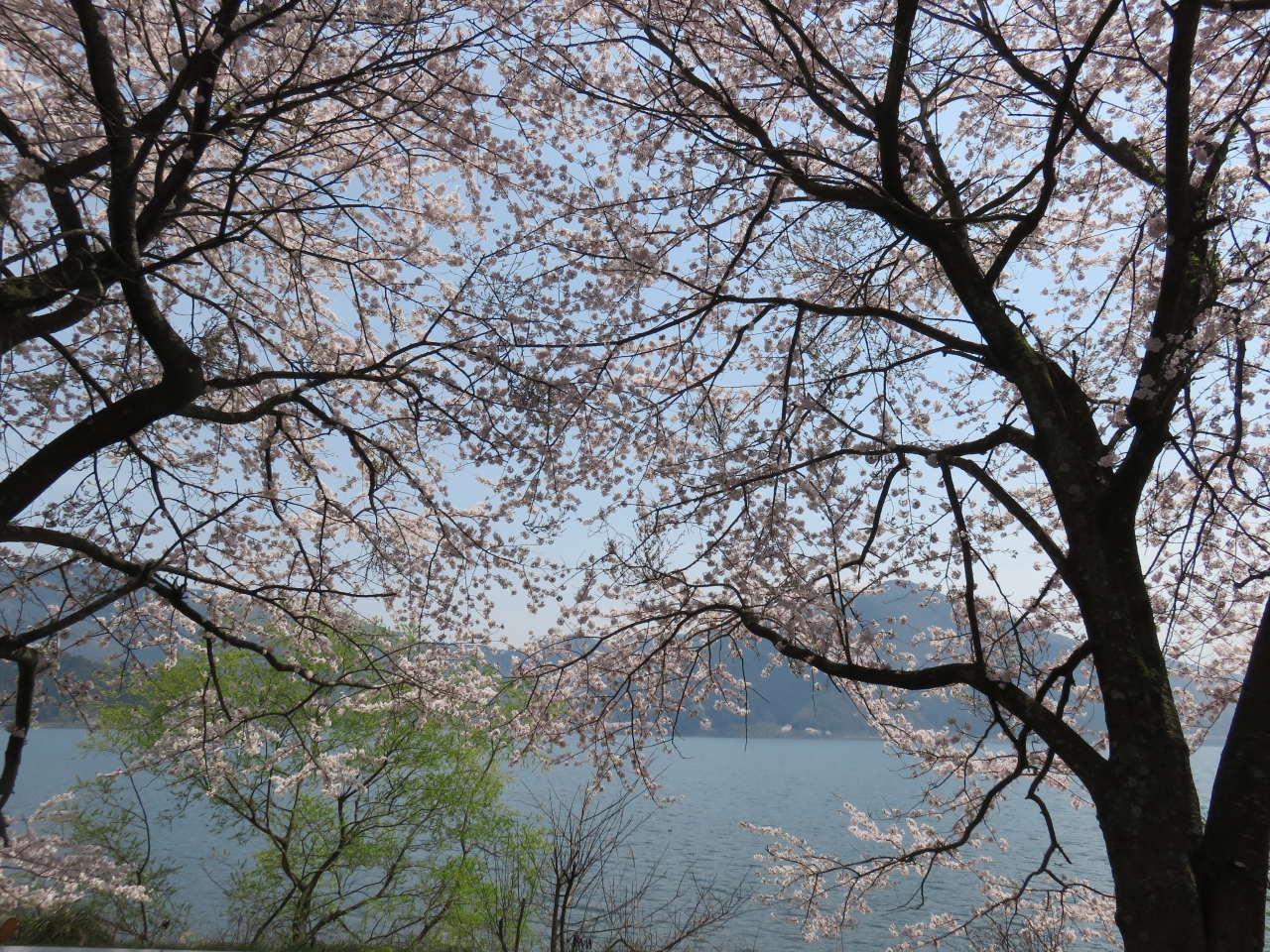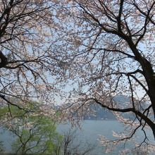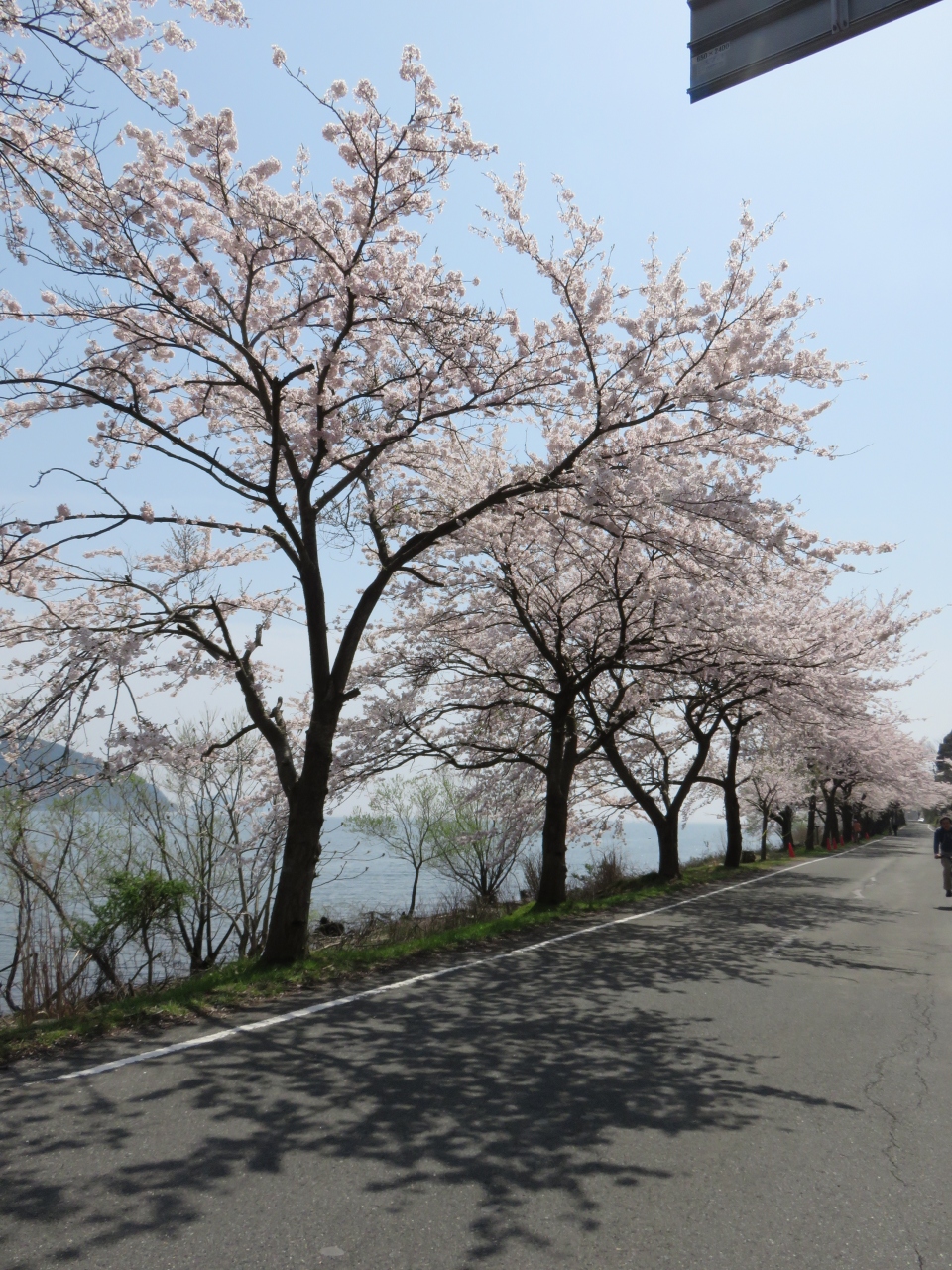 桜の時期の週末は一方通行になるため、車停車して湖岸の道歩くことおススメします
