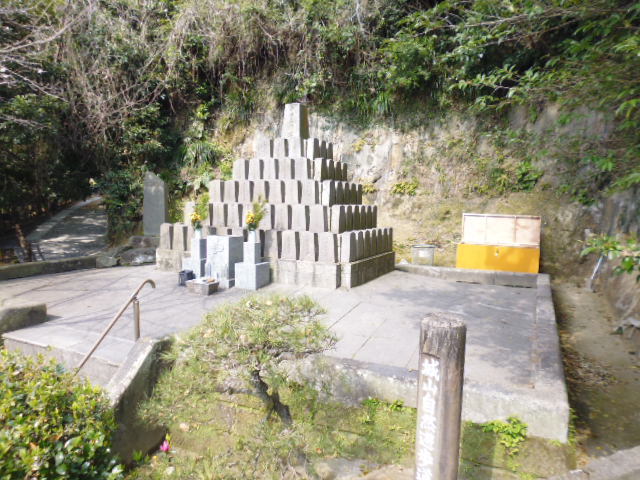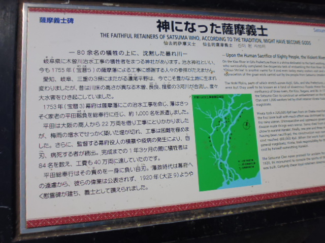城山に行く途中にある義士の碑で今でもボランティアの方が掃除をして解説をしてくれています。かつてここ薩摩から岐阜、愛知方面に川の修繕で派遣された人たちが亡くなってのを弔う碑です。