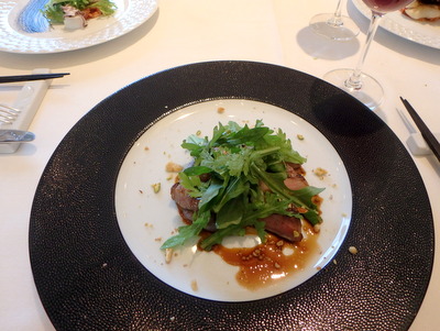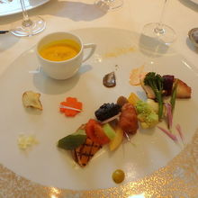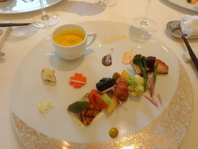 シャンパンで乾杯した後、前菜は20種類の野菜を使った、かわいらしい一皿。