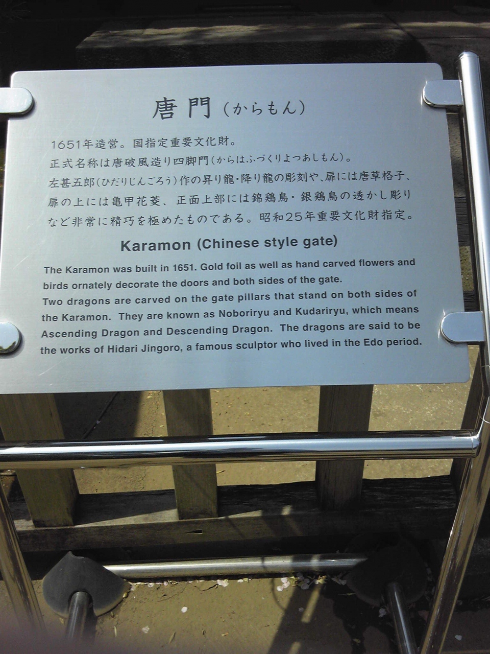徳川家康を神として祀られている上野東照宮のなかにあります。日光とおなじく、彫刻で有名な左甚五郎が作ったとされる、昇り龍、下り龍の彫刻があり、見どころのひとつとなっています。またあざやかな配色やこまやかなつくりは圧倒されます