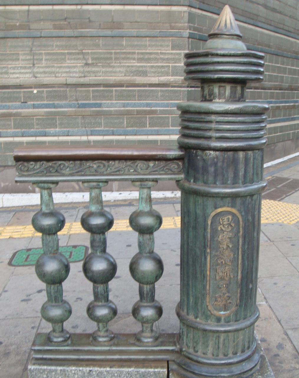 路面電車の思案橋電停近く、架かっていた場所に欄干の形をした碑が建っています。