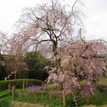 京都の観光名所「平安神宮」と「知恩院」のちょうど中間あたりに位置する小さな庭園ですが、その入口を入ってすぐ目の前にあるのが、見事に枝垂れた大きな桜の木。