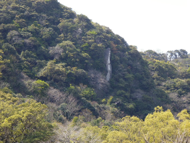 仙巌園のなかほどの御殿から少し行った辺りから裏山のほうを見ると、きれいな滝があってその滝の脇に大きな文字が書かれています。